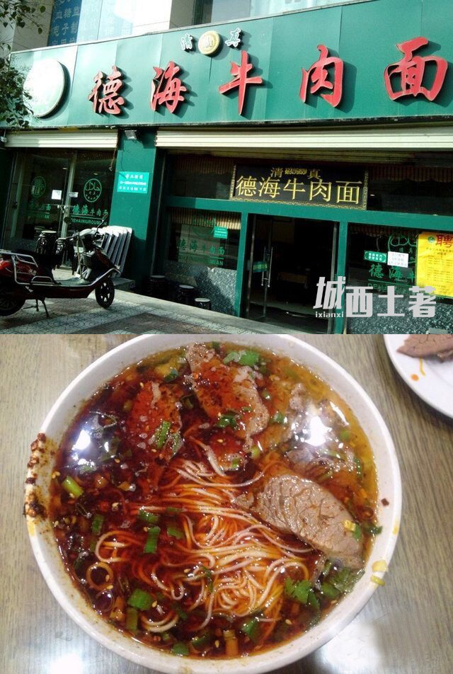土著哥第一次去德海牛肉面是三年前的冬天,住怡丰城附近的朋友说这家名气特别大,是公认的西安最正宗的牛肉面,没有之一。晚上8点多进店时发现基本所有座位都满了,这让土著哥大吃一惊,本以为很多顾客都是附近住户,后来听说不少朋友都是转成开车去吃的。它家的面特别筋道,牛肉的分量也不少,汤里有一片白萝卜,还撒了不少的蒜苗和香菜,不得不说的是德海的油泼辣子,比其他牛肉面馆的辣子要香很多。唯一让土著哥觉得失望的是它家服务员的脾气比较火爆。