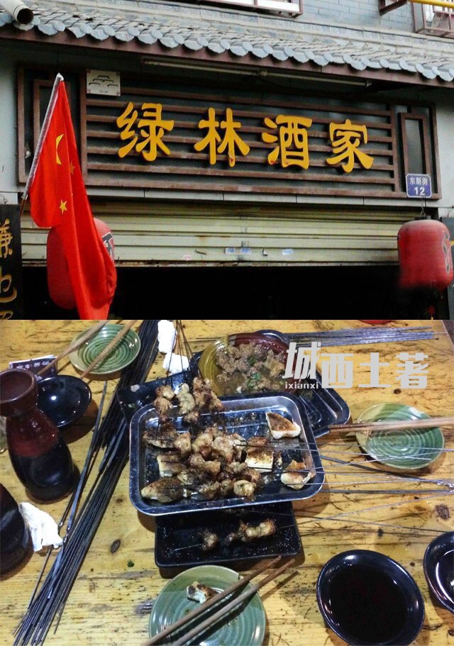 绿林是土著哥和朋友喝黄酒的必去之处,是三年前一个住在民乐园的朋友推荐的。酒馆的面积不大,光线比较昏暗。它家以烧烤为主,特色是烤包子、烤猪蹄和黄酒。包子外酥里嫩,不油不腻;猪蹄非常入味;黄酒(土著哥是来喝热闹的,怕点评的太业余,闹出笑话,就不在这儿得瑟了)。土著哥这种粗人其实不喜欢逼格太高的地方,绿林正巧满足了土著哥的需要。在这里约上三四个哥们儿,叫伙计烤一把筋儿,再烤个香仔肠、包子、猪蹄,上一盘素拼、热几壶黄酒,摇骰子、划拳、喝酒,没有比这更惬意的事了!