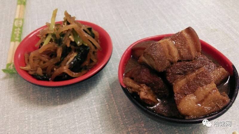 免费小咸菜和坛肉,咸菜就是芥菜疙瘩,豆腐锅口味清淡,正好搭配。