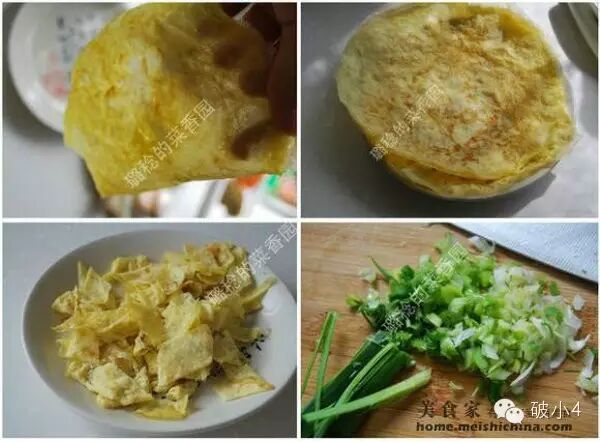 5、摊好的蛋皮,薄可透光。 6、一个鸡蛋加一半温开水,正好可以煎三张这样的蛋皮。 7、切成菱形。 8、蒜苗洗净、切碎待用。 ![]()