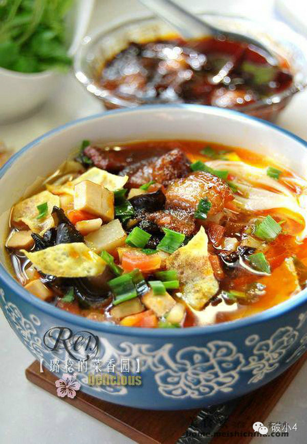 五、浇汤 正宗的岐山臊子面都是用手擀面,要擀得非常薄,再用大刀切细,面条煮出来半透明状,又劲道又光滑,这就是人们常说的“薄、筋、光”。也可以买现成的面条来煮,要买那种“二宽”的薄面条。 面条捞入碗中(面条一定要捞得少,汤多一些),浇上一勺汤、一勺底菜。再浇上一大勺肉臊子,点缀一把蒜苗末,一碗“酸、辣、香”的岐山哨子面就做得嘞~~~ 我做的这个面还是捞多了,再加上拍照,面都有点儿哝了,肉片也切的大了些,正宗的岐山面比这个要瞭十倍!