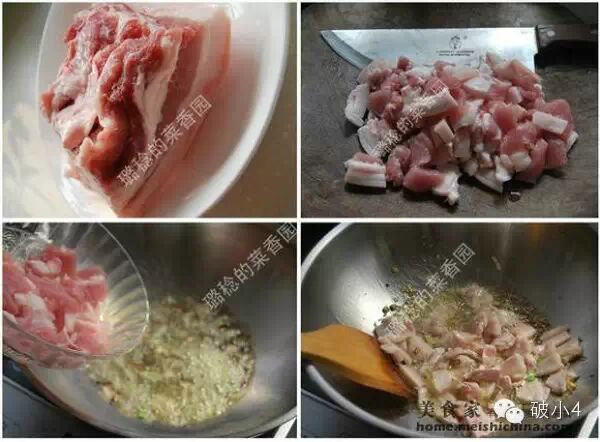 【岐山哨子做法】 制作方法: 一、做肉哨子 1、选精五花肉。 2、洗净,连皮切成1cm见方的小片。 3、给锅里放上油,油热后放入葱丝、姜丝煸出香味,放入肉片(最好先放肥肉,待肥肉炒至肉皮发亮,开始吐油时,放入瘦肉一起炒)。 4、改小火,不停的煸炒肉片。 ![]()