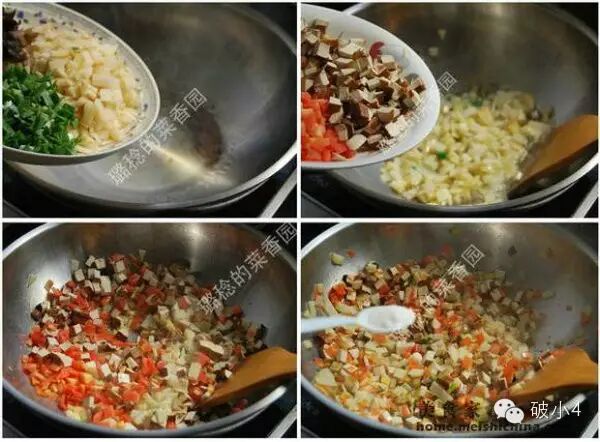 3、炒底菜:锅内油烧热后,先下土豆片。 4、再下豆腐干丁。 5、下胡萝卜片。 6、加盐2勺。 ![]()