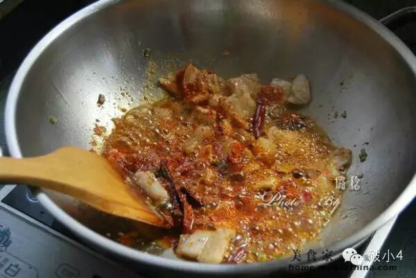 9、炒至肥肉吐油、各种香料的香味完全激发出来。 10、火开大,倒入醋(醋一定要多!肉和醋的比例一般为2:1,即一斤肉半斤醋的比例)。 11、然后小火慢煮,盖上盖子煮10分钟左右,让其入味。 12、煮至汤汁浓稠,辣椒面和各种调料面的香味和肉片出的油香完全合二为一,肉臊子基本上就“揽”好了。(陕西人一般把炒肉臊子不放水的方法叫做“揽”) ![]()