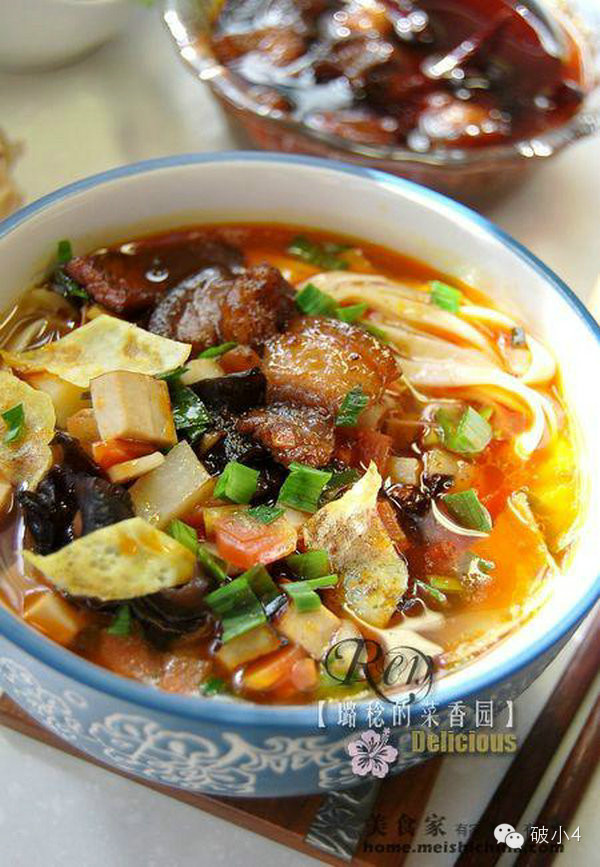 做为一个在陕西生活多年的吃货,稔曾经吃过各种正宗或者非正宗的岐山哨子面 臊子面是西府特产。西府指的是关中平原西部,宝鸡市的辖区,核心地带就是岐山和扶风两县。 记忆中,最好吃的一次要数和同事一起去他扶风的老家,天寒地冻、几个人长途奔波数小时个个饿得嗷嗷直叫迈进家门,主人家一人一碗热汤面端将上来碗不大,面也不多,只够一筷子夹,吃完一碗,立马又端来一碗,如此这番……我连吃了三碗,吃的细细密密的汗挂了一额头,香的满嘴找不到舌头内啥,还想吃,没好意思。 同去的小伙,甩开腮帮子,咧开后槽牙,居然一口气咥咧10碗!后来才知道我们吃的是当地最有名的“一口香”。 一口香也是岐山哨子面的一种,一碗就一筷子面,主要吃菜和肉。 岐山哨子面讲究面要擀的薄,薄可透光,但吃起来却非常筋韧利口,那汤更是至今想起来都口水滴答,红红的一层油浮在面上,油大却不腻,因为有醋,不是一点儿醋,入口第一感觉不是辣,是“酸 !浓烈的酸香味会让将你所有的味蕾瞬间唤醒~~”也就是说岐山臊子面的香,全在醋里。 酸汤里还有黄花、木耳、油炸豆腐切丝、哨子肉、葱花,对了,哨子肉,不是肉丁,是肉块,额滴神啊,乡党们太实在咧!~就这,主人还在一碗一碗往桌上端,还一个劲儿的说,“再吃嘛,再吃!”额们这儿的小伙子哪个不吃个二三十碗的! 之后的很长时间里,稔一直琢磨着在自己家里做次岐山哨子面,可迟迟不敢动手 为撒? 因为一碗看似普通的岐山面,讲究却颇多,概括起来有一个“九字口诀”,基本上涵盖了岐山哨子面的所有特点——即“酸、辣、香、薄、筋、光、煎、稀、汪。” 臊子面分为宽、窄、细等七个花形,面食讲究“薄、筋、光”,汤讲究“煎、稀、汪”,味道自然是“酸、辣、香”。 下面一一解释。 酸---用岐山醋使汤料突出酸 辣---用煎油泼辣子面,使其汤料辣里透鲜 香----臊子有一种独特的香味 薄---指面条用手擀的很薄 筋----面条薄而不哝 光---面条光如游鱼 煎----汤料温度很高 稀---每碗只吃一口,面条很少,一般的人要吃10多碗,小伙可以吃到2、30碗 汪--汤料的油很多,封住了汤的热气,即使数九寒天,也不容易放凉。 颜色上有讲究—— 在菜色上分红(红萝卜)、黄(黄花或煎蛋皮)、白(豆腐干)、黑(木耳)、青(韭菜或者蒜苗) 菜形上也有讲究—— 分别用到菜蔬的不同部位,“根、茎、叶、花、藻”五端。根应该指的是胡萝卜、茎指的是蒜苗、叶指的是韭菜、花指的是黄花菜、藻我想是不是木耳? ![]()