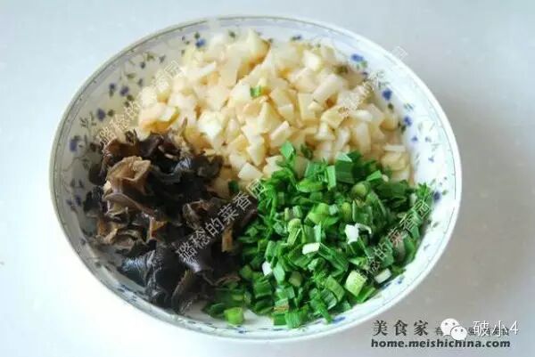 三、准备底菜 1、胡萝卜切小薄丁(注:是小薄片,不是小方块)、豆腐干切小丁。 ![]()