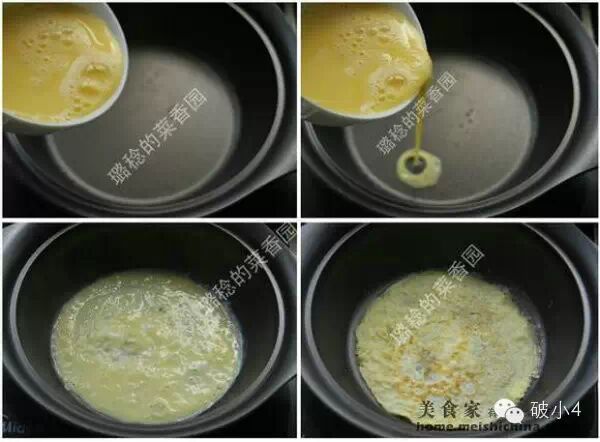 二、准备漂菜 漂菜,顾名思义,就是漂在汤面表面的菜。 岐山臊子面里的漂菜也很有讲究。基本都是半成品或者易熟的食材。直接浇汤烫烫就能入口的。比如“煎蛋皮、还有韭菜或者蒜苗切末”(秋冬季就用蒜苗,蒜苗比韭菜更香) 1、煎蛋皮:鸡蛋打到碗里,加鸡蛋一半量的温开水,搅打均匀,锅内抹薄薄一层油(油一定要少,油多了,蛋液会挂不住,在锅里乱流,厨房新手最好选用不粘锅)。 2、等锅子稍热时,就慢慢倒入蛋液。(蛋液最好提前用筛子过滤一下,就不会有这么多气泡了。有气泡会怎么样?受热的时候表面会形成一些窟窿, 如何补救?用木铲小心刮平就好) 3、转动锅子,让蛋液均匀铺满锅底。 4、一面刚刚凝固(如何判断?端起锅子轻轻晃动,蛋皮儿能够移动,就说明一面凝固好了)。 ![]()