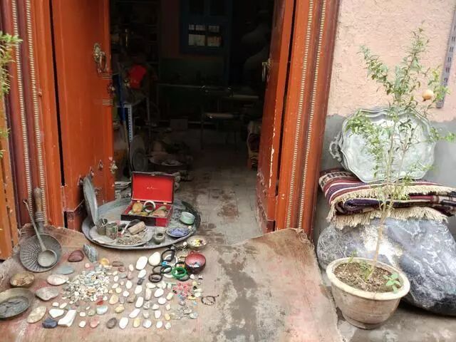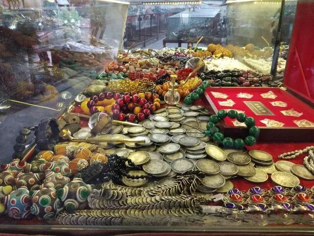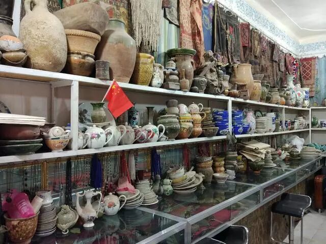 碰巧下雨了,喀什的秋雨下得细腻、直接,打在了装饰古币的玻璃框上。这是适合逛老物件铺子的时间,会让人更加心静地细看这些看似值钱或不值钱的老物件。我看了都想要一个,最后选的却是不是最想要的,大概是因为我真的是古董盲吧?