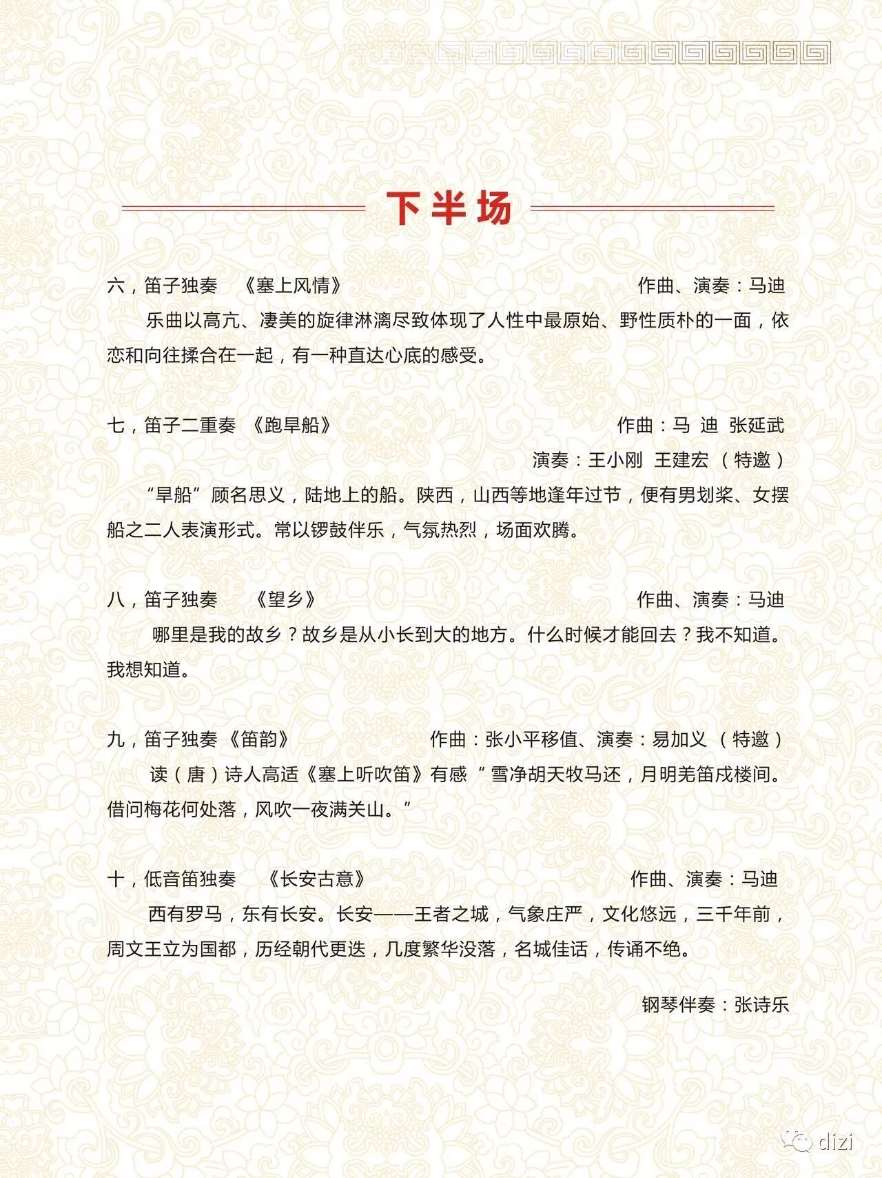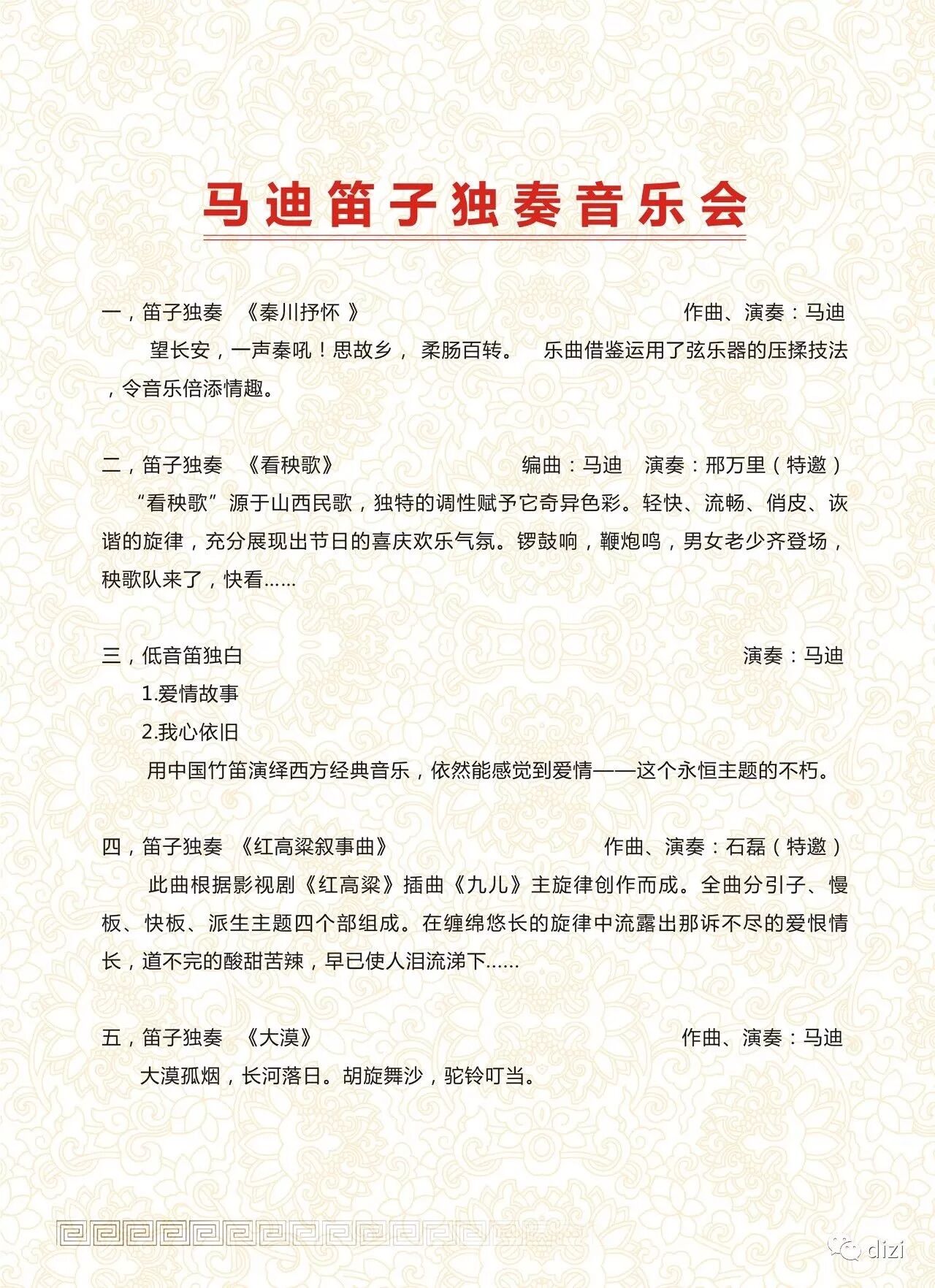 本次音乐会,马迪老师除演奏了他的经典代表曲目《秦川抒怀》、《望乡》、《大漠》、《塞上风情》,还演奏了几首即兴小曲如《我心依旧》、《爱情永恒》、《信天游随想》,这次音乐会,还带来了他最新创作的大G低音笛独奏:《长安古意》。