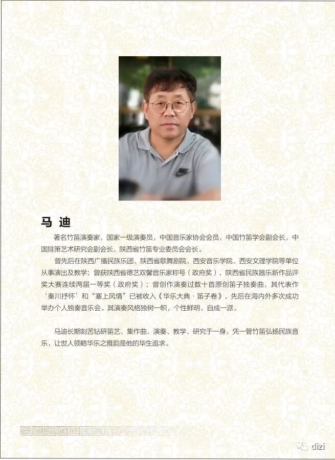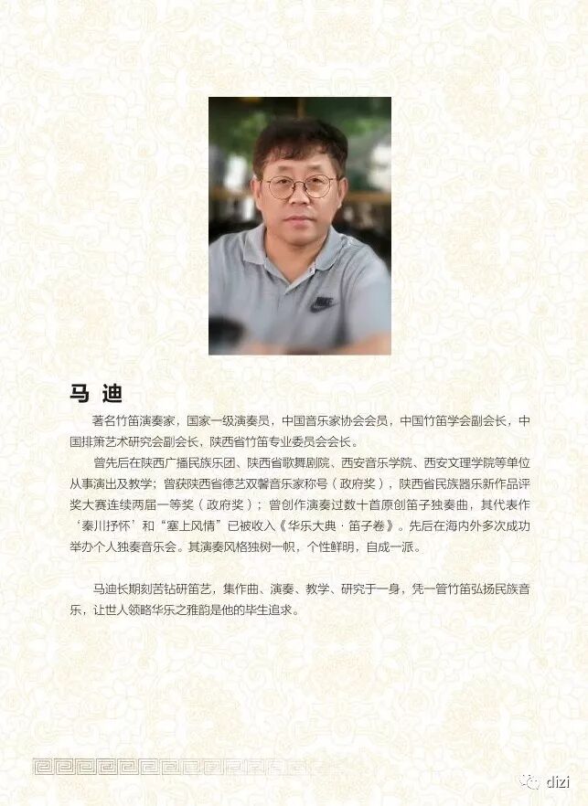 马迪先生是我囯著名的竹笛演奏家,他集演奏、创作、教育于一体,是长安笛派的领军和代表人物。他培养了很多学生,其中数位现都在笛坛崭露头角。