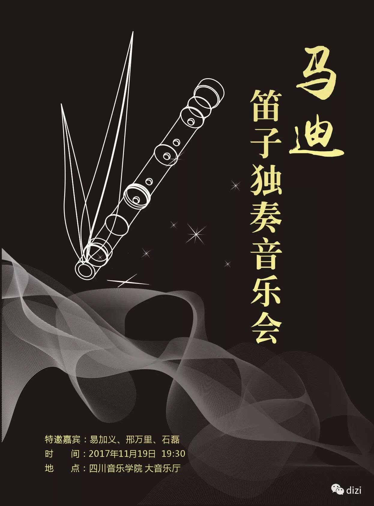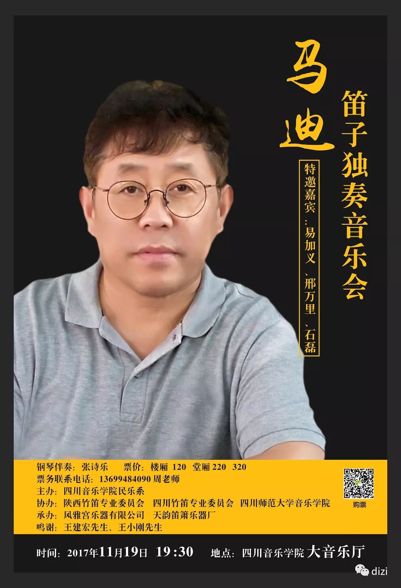 2017年11月19日晚,著名竹笛演奏家马迪笛子独奏音乐会在成都圆满举办。本次音乐会由由四川音乐学院民乐系主办,由陕西竹笛专业委员会、四川竹笛专业委员会、四川师范大学音乐学院协办,由风雅宫乐器有限公司联合天韵笛箫乐器厂承办。特邀助演嘉宾:著名竹笛演奏家、四川音乐学院民乐系原系主任易加义教授,著名竹笛演奏家四川师范大学音乐学院邢万里副教授,著名青年笛子演奏家石磊,著名青年制笛师王建宏、王小刚。特邀主持:著名青年笛子演奏家、首都师范大学音乐学院竹笛教师胡玉林。 中国音乐家协会竹笛学会会长林文增教授亲临现场助阵。