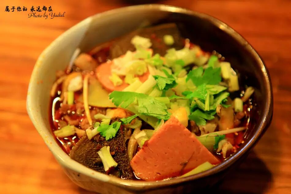 冒菜,是成都的特色菜,“冒”字在这里是动词。准备一锅麻辣鲜香的汤汁,把菜用一个竹勺装好,一般一勺就是一份。在锅里煮熟,然后盛到碗里,顺便再舀一勺汤汁,再撒上点香菜、葱花和四川特有的豆豉,就成了成都最有名最特色的小吃“冒菜”。简单点说“冒菜就是一个人的火锅,火锅就是一群人的冒菜。” 推荐店面:冒牌火锅菜 (双栅子街店),地址:成都市锦江区双栅子街12号(王府井后侧)。