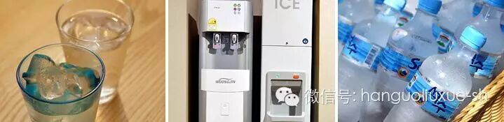 中国人来韩国旅游,经常不适应韩国到处都是冰水伺候的习惯。有人说是因为韩国人性急,有人说是因为韩国人有从小吃人参的习惯所以导致体热,而大冬天到处也是暖烘烘的暖气……总之,韩国人一年四季都偏爱冰水。去餐馆,端上来的都是冰凉冰凉的白水或大麦茶;饮水机也大都只有冰水和热水,而没有常温水的概念;去商店买水解渴,瓶装矿泉水也基本都放在冰柜里。如果你不适应喝冰水的习惯,一定要学会对服务员说“大得滩木儿组赛哟(请给我热水)”,或自己带随行杯啦。