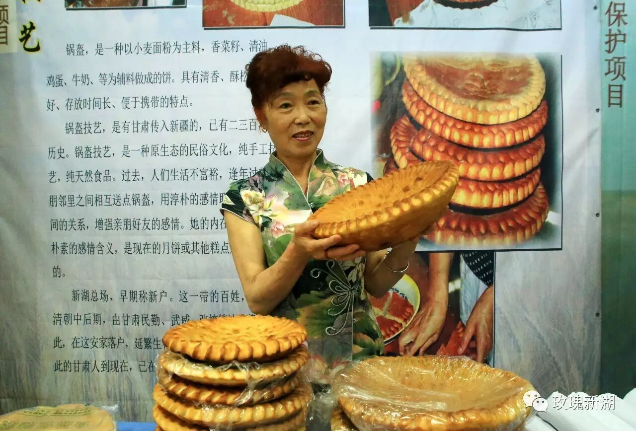 锅盔是西北陕西、甘肃、宁夏、青海、新疆等地流传已久的民间小吃,新湖锅盔技艺是由甘肃传入,至今已有二三百年的历史。以新湖四场李清翠为传承人代表的新湖农场锅盔技艺,已被列入兵团级非物质文化遗产。