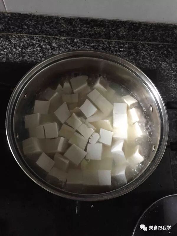 锅里放水,加入少许盐和豆腐,煮沸至用凉水浸泡待用;