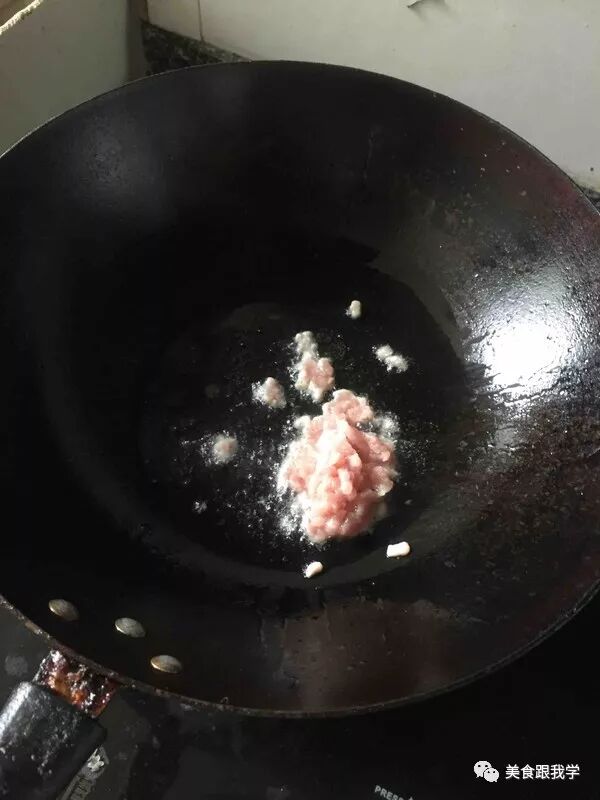 炒锅放少许油,微热放入切碎的肉丝末;