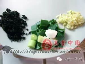 2、豆豉、豆瓣酱剁碎,青蒜切段,姜切末