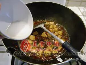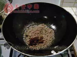 4、待牛肉馅炒成金黄色,放入豆瓣酱同炒