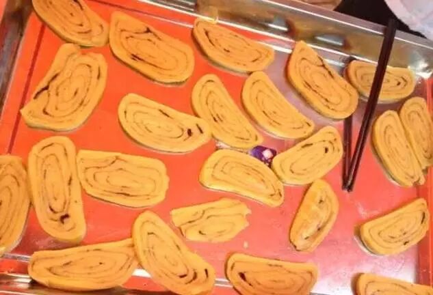 摊黄由米面或玉米面发酵,制成糊状,用专门的鏊子慢火烙成,这鏊子底是凸起的。舀一勺面糊,顺凸顶倒下,流到边楞挡住,自然成为圆形,然后盖上盖烙,听的盖上水蒸汽滴下来响三声,就说明熟了,铲在盘中,状如满月,底焦面黄,边厚中薄,香气扑鼻,尝一块,略酸带甜。陕北好像有句话叫:四月八不吃摊黄不的发,吃了摊黄就倒塌。“摊黄”可能就是陕北的风俗。