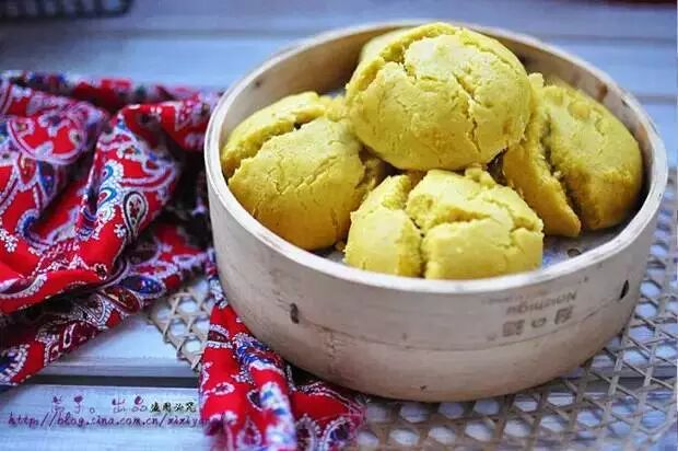 用硬糜子去壳,加入浸泡、沥水、磨粉、过箩,四分之一面粉用开水烫成糊放在锅中蒸熟,将蒸熟的面糊和剩余的面粉和成面团,放入盆中发酵,发酵好后加适量碱水,取一小块面团(和蒸馍般大小),用两手掌挤压成饼状,包入备好的豆沙馅,放在笼上蒸熟取出即可食用。色泽金黄、细腻软甜,味道盛佳。