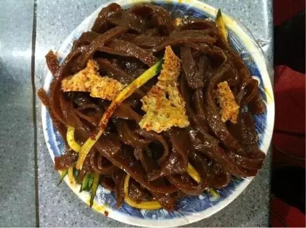 把猪大肠洗净,切成长约40公分段,一头用线扎死;荞麦粉用水和成面团,再加入少量水搓,搓匀后再加水继续搓,直到成糊状为止,然后加水稀释(也可用脱皮后的荞麦仁,加适量的水渗约10分左右,放在面板上用擀面杖压碎,放入盆中加水和成面团,然后再加少量水揉搓,后加水稀释,用箩过滤)备用。然后灌入备好的大肠内(灌半饱即可),用线扎口,放入盘中上笼蒸熟后出锅冷却即可。将冷却的灌肠切片或丝,加入麻辣肝、蒜泥、辣椒油等佐料拌食。