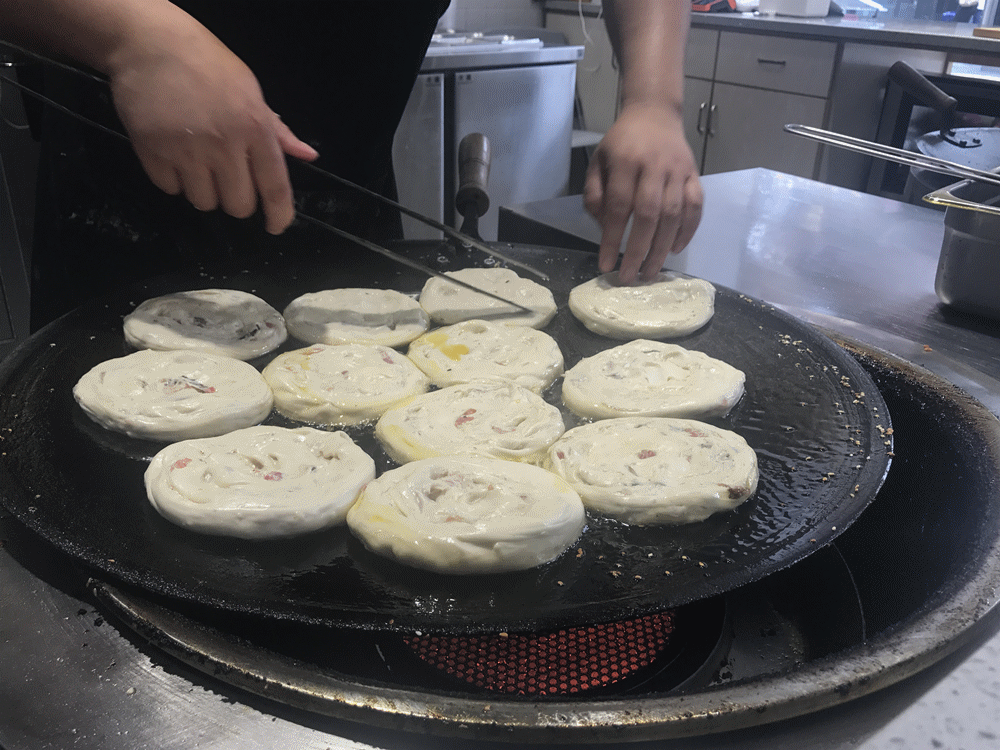 制好的锅魁胚子要下到锅魁专用的鏊(大铁锅)中不断用油煎,在这个过程中,师傅得不停的顾着翻面,使其受热均匀,直至锅魁两面金黄到符合要求才行,此时呀,这锅魁透出的诱人的香味已经能把人馋死!