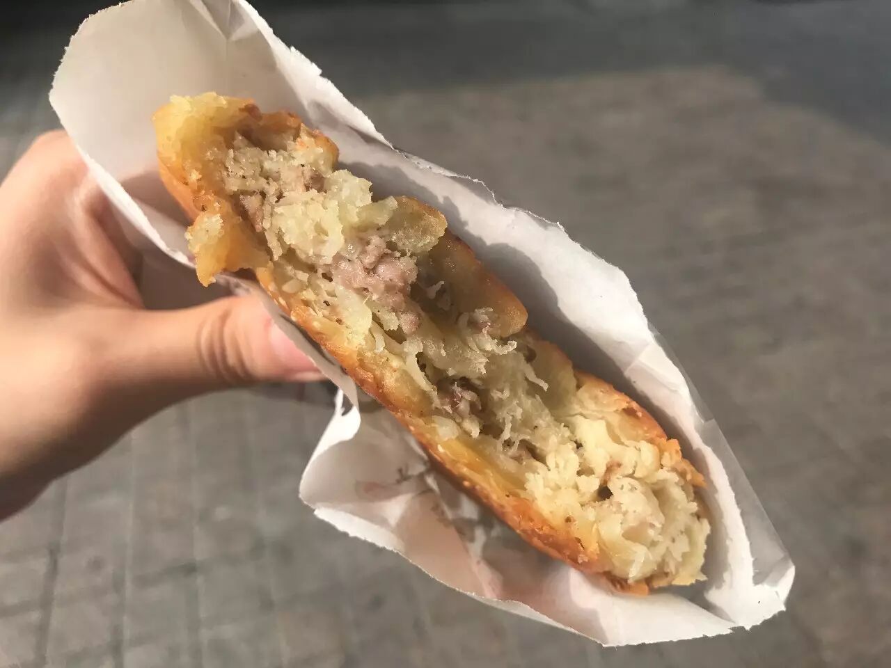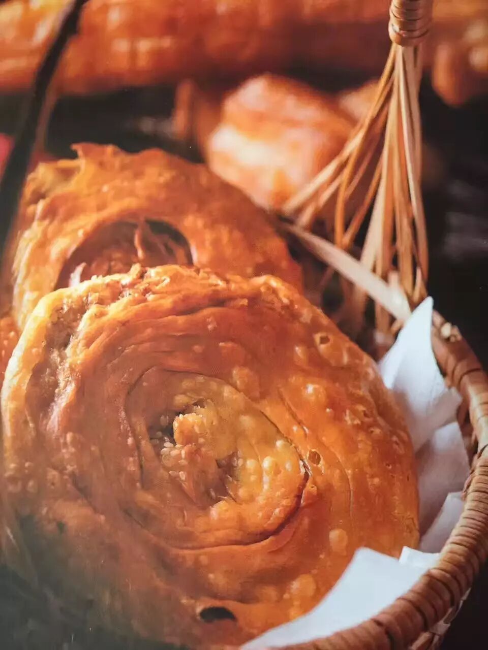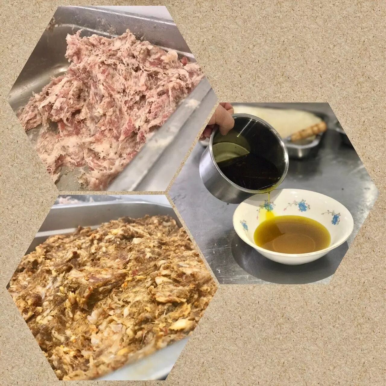 把一个个小面团,用擀面杖擀成长条形,均匀地往里抹上口味肉馅。再把加好馅料的面饼,卷成面团,重复一次,上第二遍肉馅。