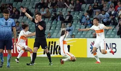 5月25日,裁判吹响终场哨声后,山东鲁能泰山队球员庆祝晋级。当日,在悉尼进行的2016亚冠联赛八分之一决赛次回合比赛中,山东鲁能泰山队客场以2比2逼平悉尼FC队,双方总比分战成3比3平,山东鲁能泰山队凭借着客场进球多的优势,成为继上海上港队后第二支晋级本赛季亚冠八强的中国球队。
