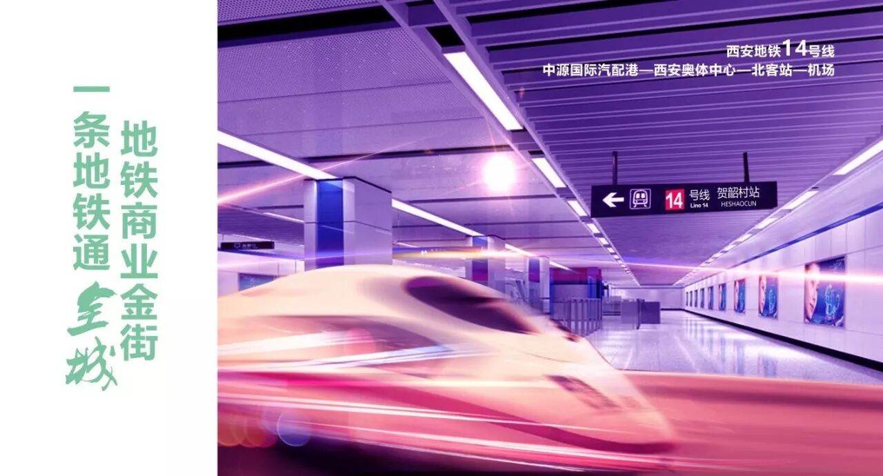 西安地铁14号线,从中源国际汽配港西侧的贺韶村站出发,经体育中心站(2021年第14届全运会主会场),西安北客站,最终到达西安咸阳机场。