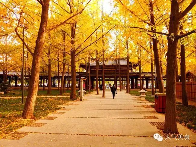 唐大慈恩寺遗址公园北接大雁塔北广场,东临戏曲大观园,设有遗址区、古亭飞瀑、杏林茶社及休闲平台等景观。金黄色的银杏叶在温暖的阳光中飘落在公园内,慢慢积成堆积成片。落叶布满的黄金街道仿佛世界一切都停止了。