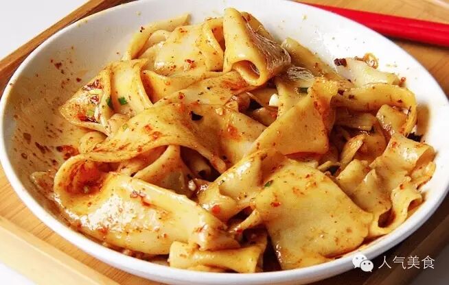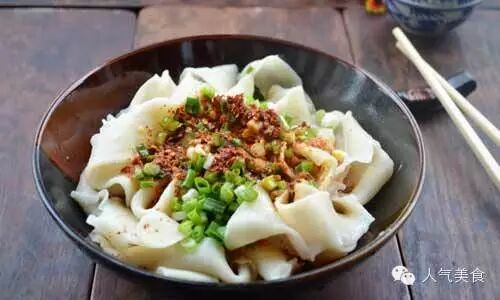 陕西扯面的形状,有拉拽宽厚如腰带的大宽长面,俗称“biang biang 面”,有细薄似韭叶的二宽面;有细如银针的龙须面,有粗继如筷子的箸头面,有三棱形似宝剑的剑刃面;有拽成短节的“空心面”。 陕西油泼扯面,面长不断,光滑筋韧,酸辣味美,热油浇在面上的那一刻,辣椒的香气交杂着蒜香和小葱的清香,香气四溢,浅尝一口,那就是浓浓的陕西味道。