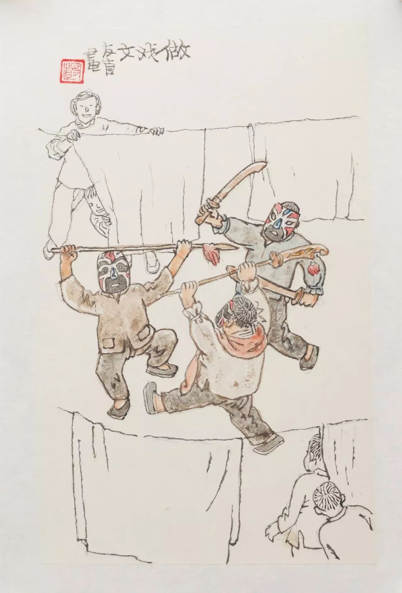 他一般不画单幅画,“就是人家要我画单幅画也要故事内容的,因为你没有故事内容作为依托的话,单画人物就变成考验你的艺术修养,你把有故事的东西变成没有故事的,这个人还是站不住的。这个内容不是故事的内容,是感觉的内容,就更高了,我没有这方面修养我就不碰,我不敢碰啊,你说我虽然农村去了那么多次,我随便画个农民,能立得住吗?立不住的。”