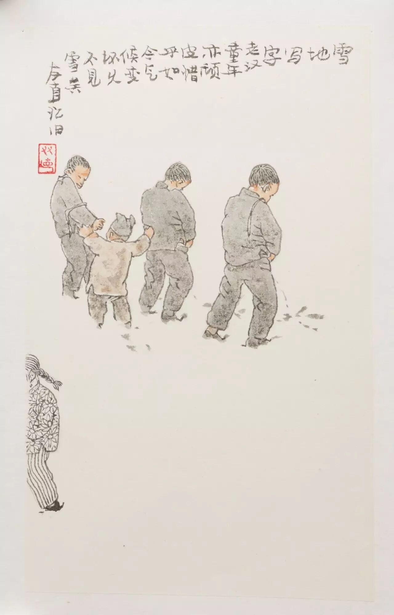 91岁的贺友直回忆儿时玩雪,画出来的竟然是几个淘气的男孩子在雪地里撒尿,边尿边写字,旁边,有个女孩害羞地躲到一边。