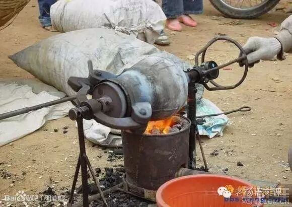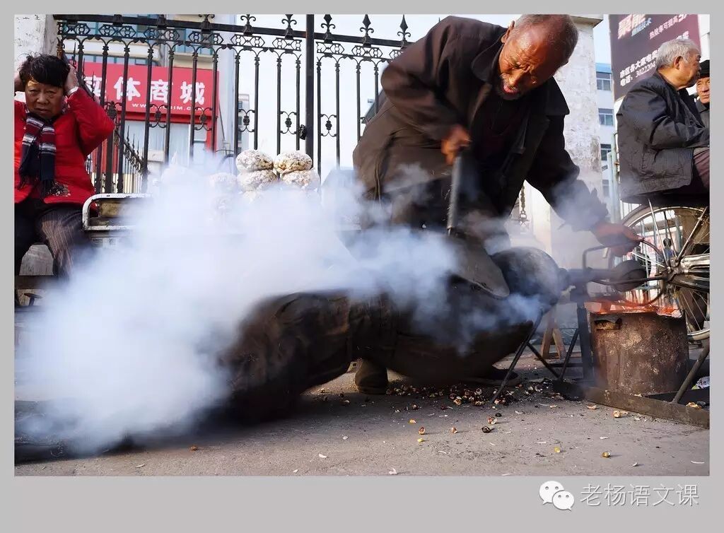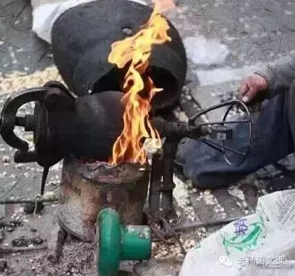 老人拿出一个小瓷缸子,盛上一缸棒子豆儿,倒进了铁炉里,剩下的豆儿倒进身后的袋子里作为酬劳。麻利地用铁管拧紧炉子,架好,拉风箱。