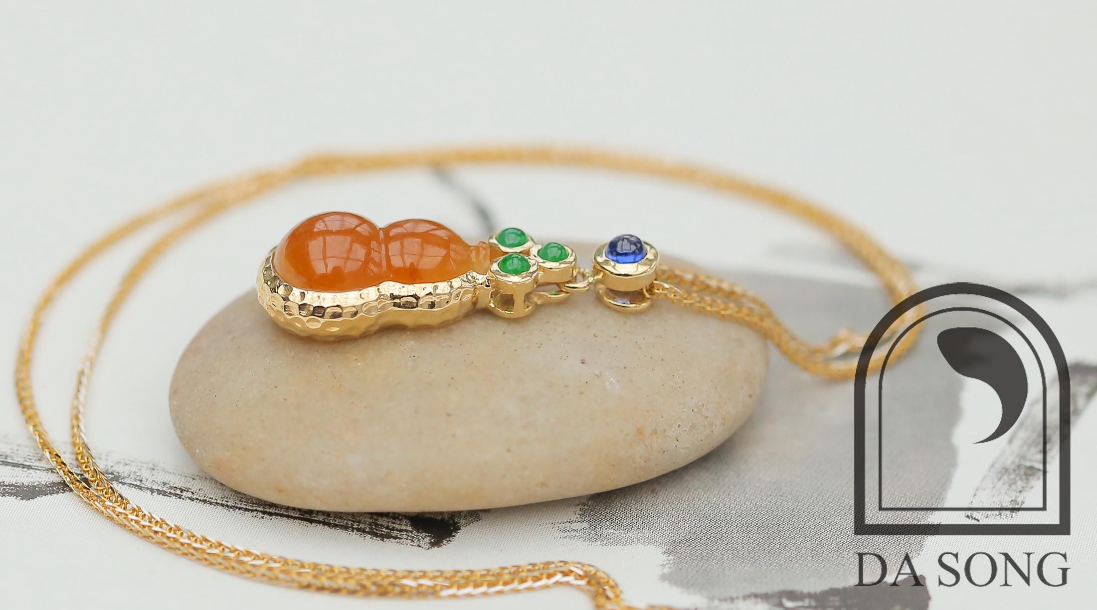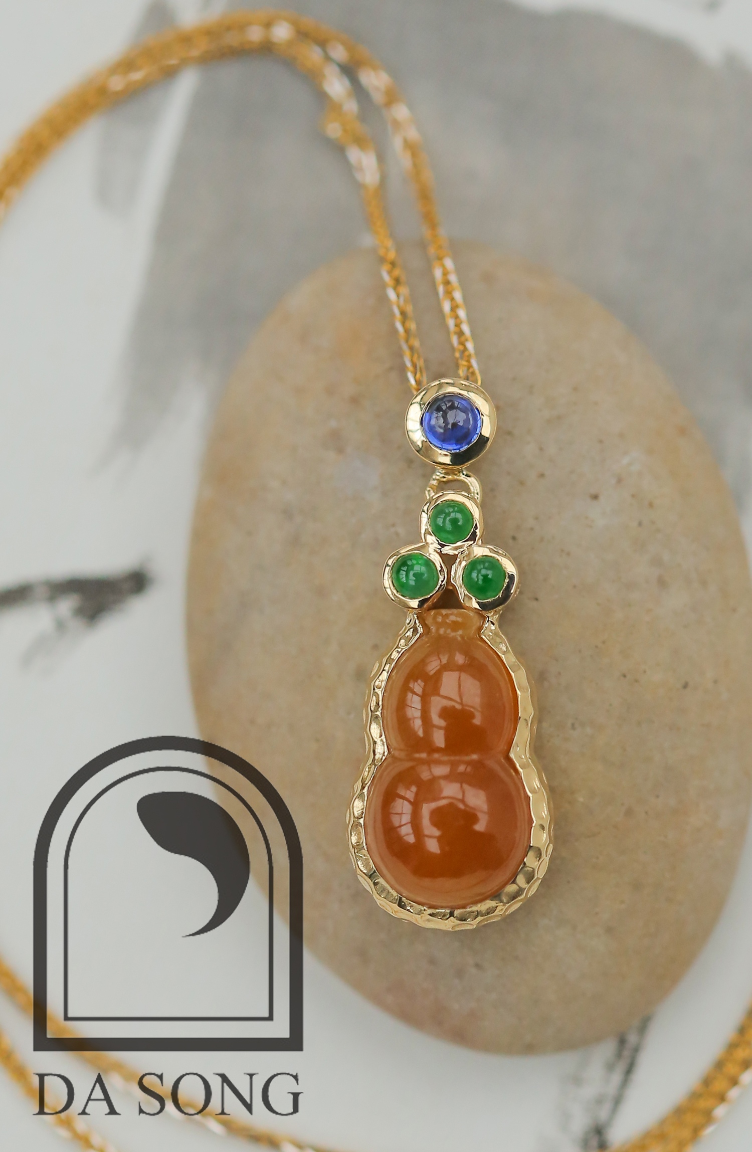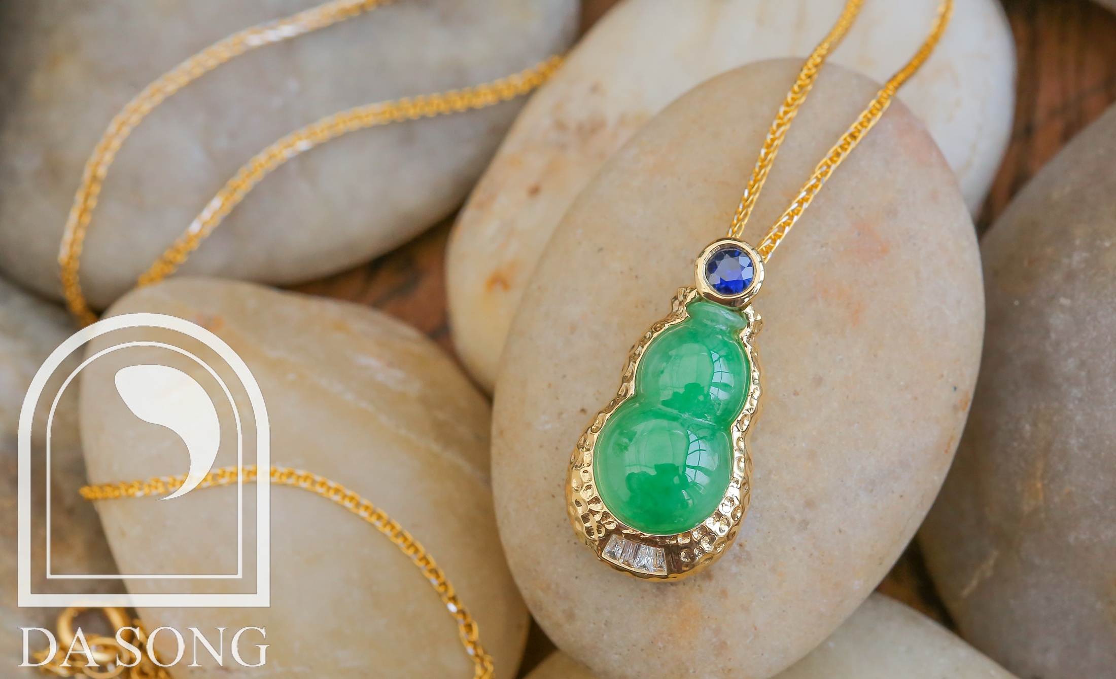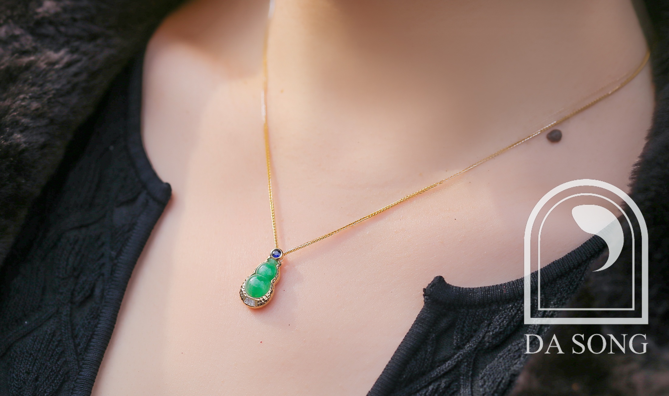 这款绿翡葫芦项链在18K黄金贴合的包裹下,金子纹路细致生动,似乎更像一个诱人的花生,让人“食指大动”。