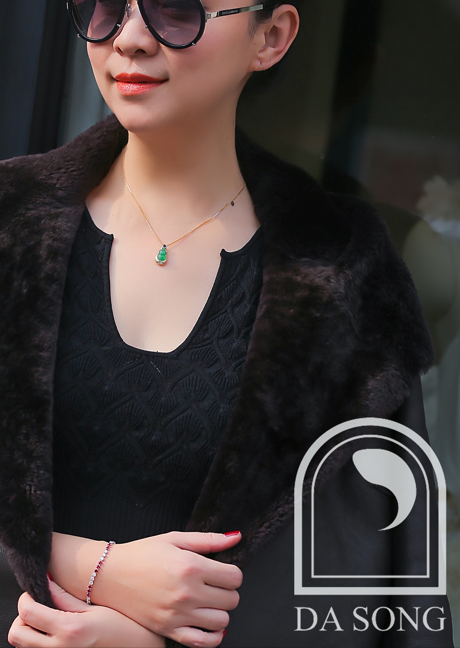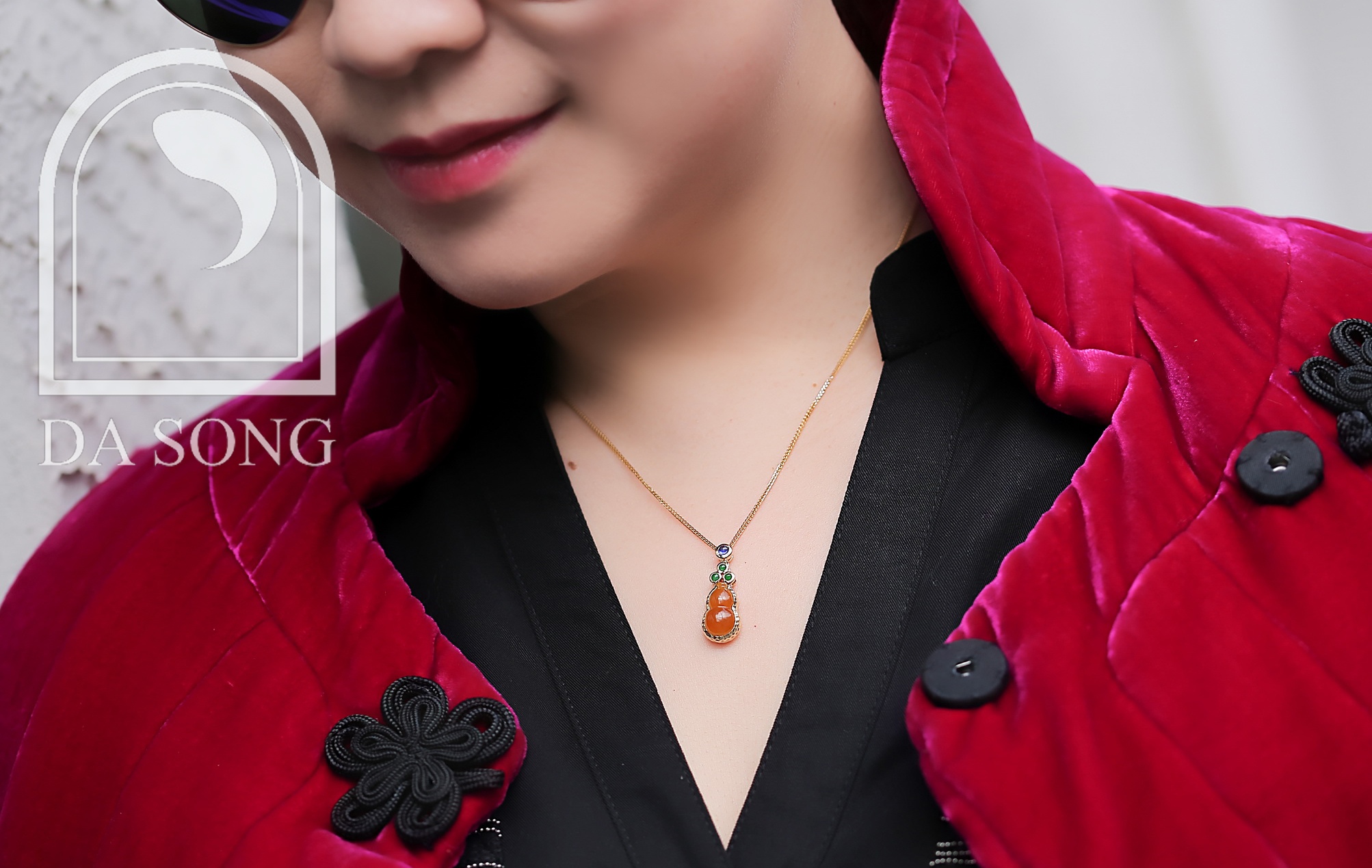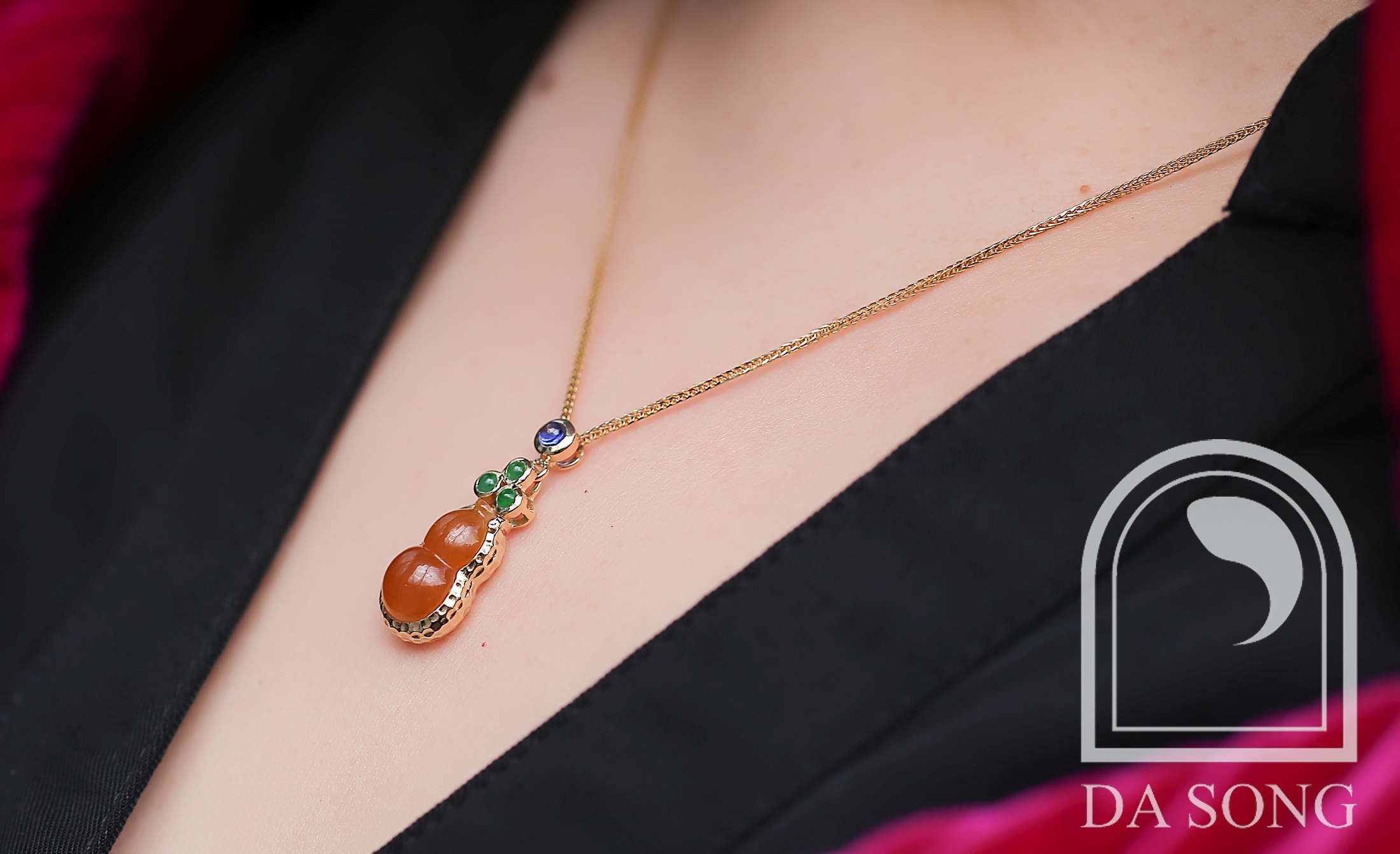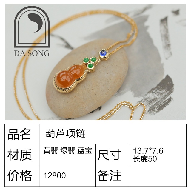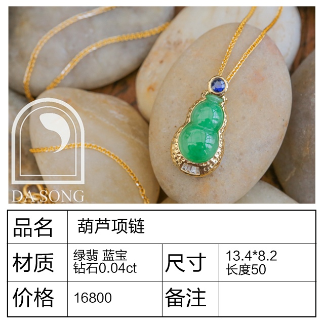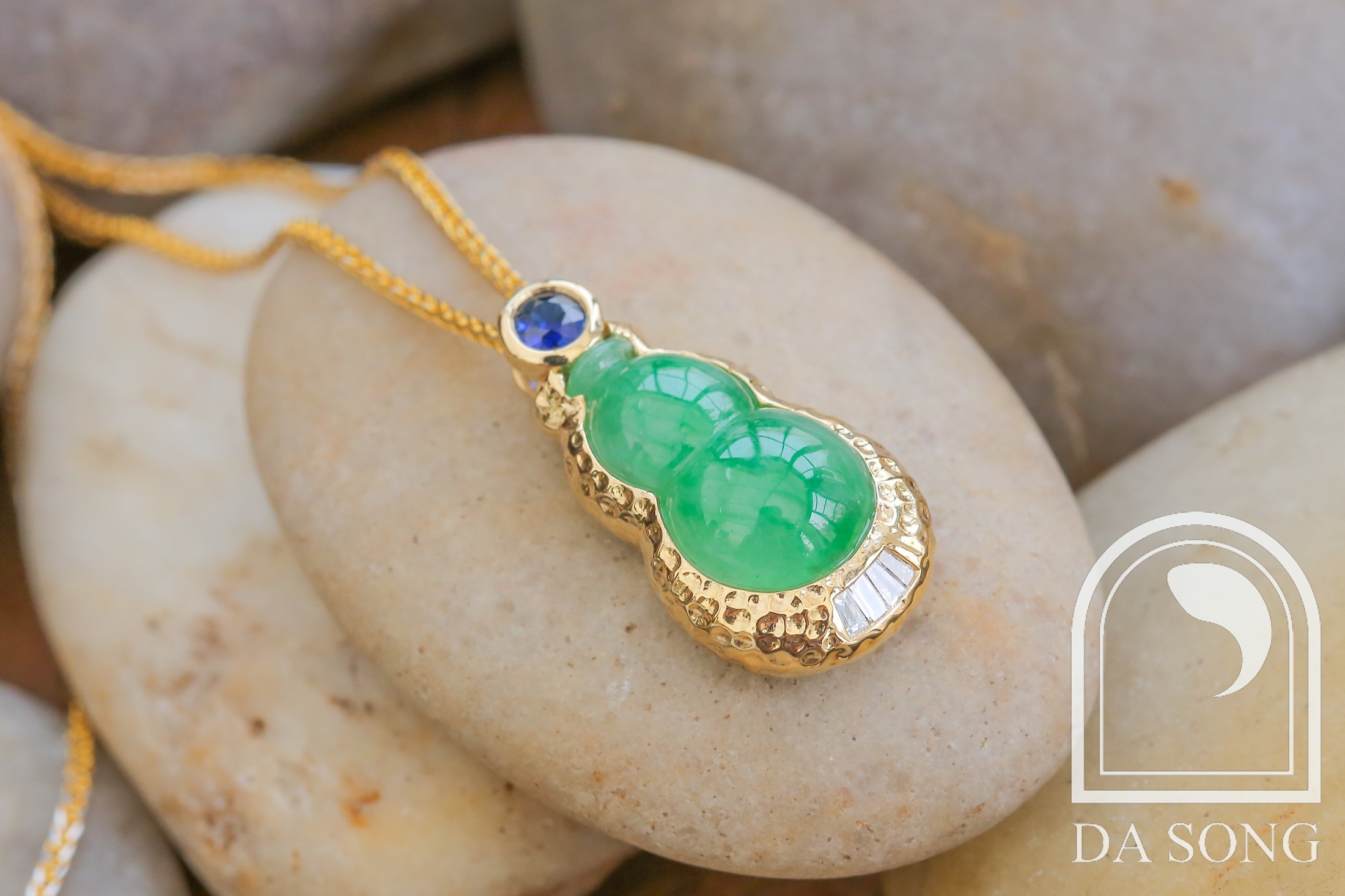 这款绿翡葫芦项链在18K黄金贴合的包裹下,金子纹路细致生动,似乎更像一个诱人的花生,让人“食指大动”。