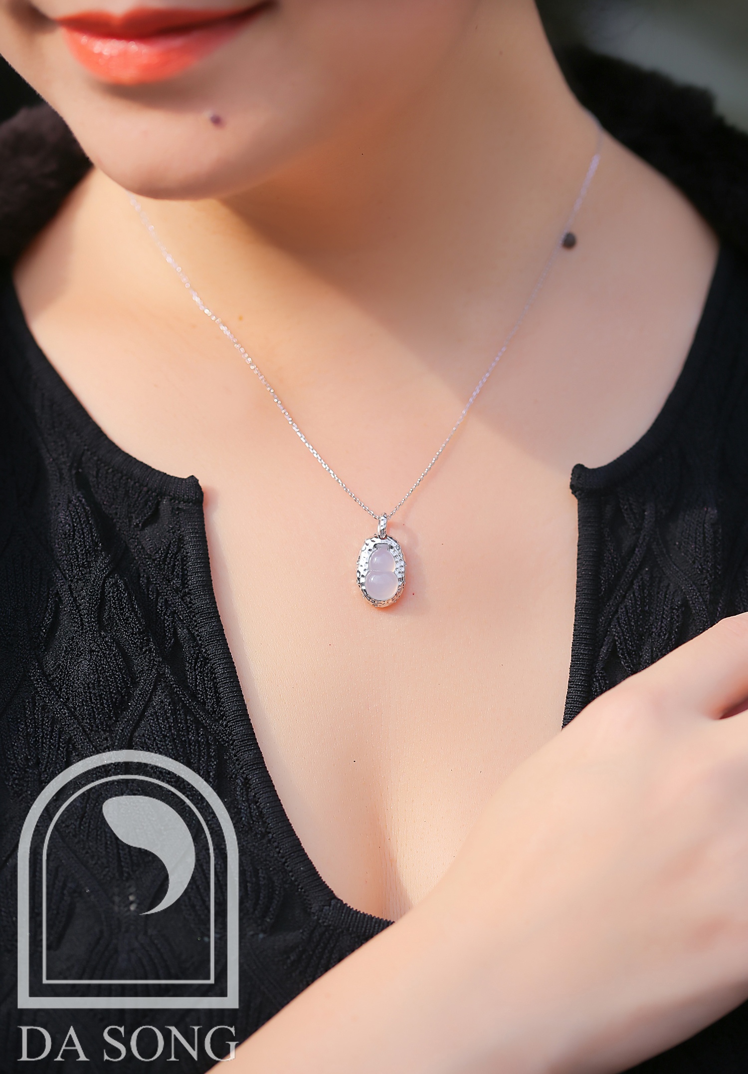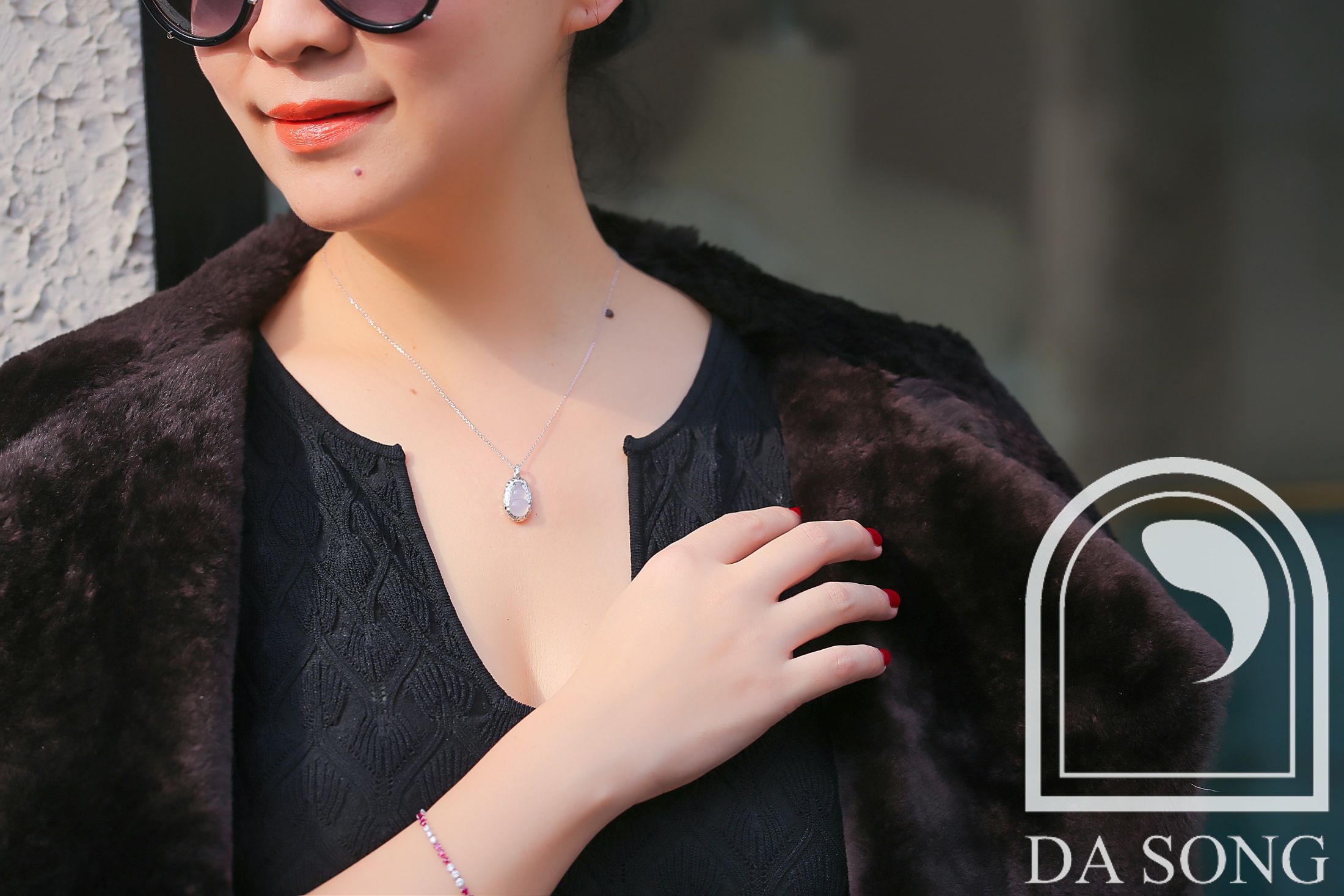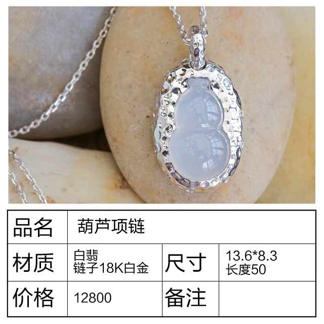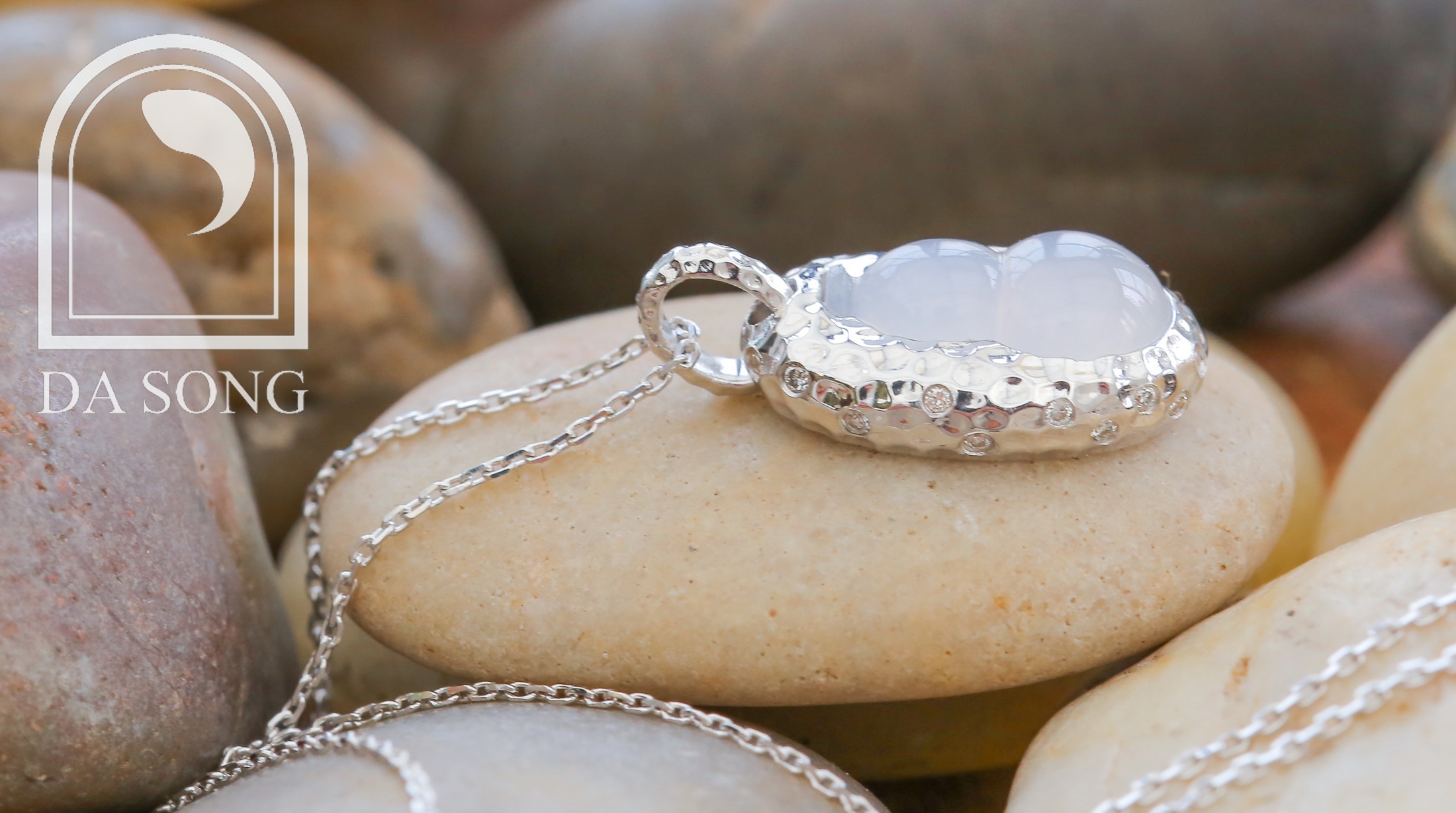 这款白翡葫芦,“清水出芙蓉”,有一种素雅灵动的感觉,非常适合秀气的女生佩戴。白金的花生皮仔细观察,可以发现设计师巧妙的钻石镶嵌设计,在阳光下,葫芦熠熠生辉,更加有灵气。