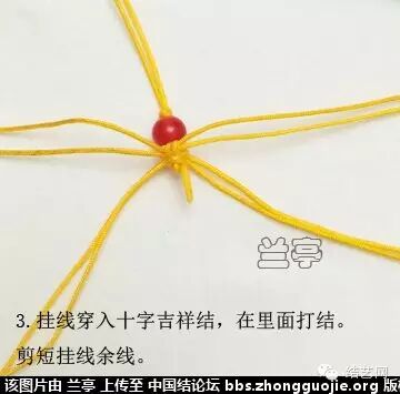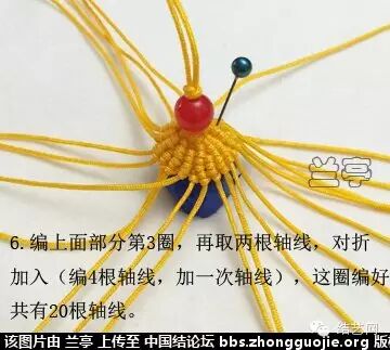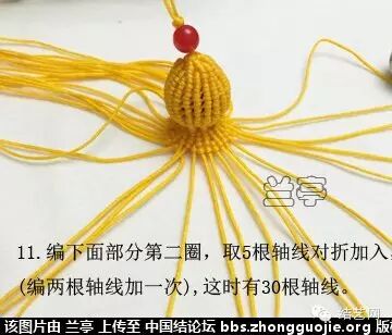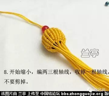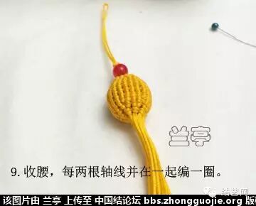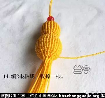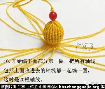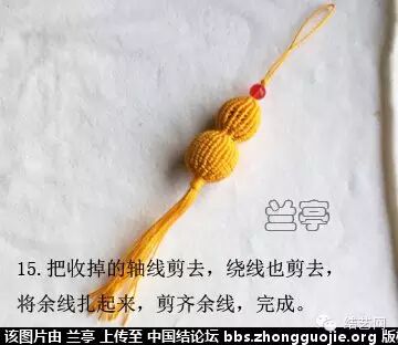 今天有兴致再编一个,随手拍下过程,跟大家分享。 用线量:A玉线:轴线45厘米*10,40厘米*5,绕线6米,挂线30厘米 用斜卷结编 要是能把下面的珠子底部磨平一些就更好了。再编大一点的: 轴线40厘米15根,30厘米7根,15厘米1根,绕线10米多一点(这根线不用剪断,整卷编)。1.取3根45厘米轴线,中间绕一截线,对折成一个小环,六根线穿入顶珠。2.另取6根轴线,编六套团锦结,这时有12根轴线。3.将穿好珠的6根轴线,穿入六套团锦结中心。4.取长绕线,将六套团锦的12根轴线,编一圈斜卷结。5.编第二圈,编2根加入1根中心轴线,这圈编好,中心轴线都用上了,共有18根轴线。6.编第三圈,对折加入轴线,编3根轴线加一次轴线。这圈编好共有24根轴线。7.编第四圈,对折加入轴线,编4根加一次轴线,这圈编好共有30根轴线。8.不加不减编5圈,放入18mm珠子或填充物。9.开始缩小,编2根收掉一根,不要剪掉。10.收腰,将2根轴线合在一起编,这样编一圈。11.编下面部分,将2根轴线分开,编一圈。12编下面部分第二圈.将前面落下的轴线再加回去,编一圈,这时共有30根轴线。13.编下面部分第三圈,将最后的40厘米7根轴线对折加入,20厘米一根也加入,就是编2根加一次轴线,这时共有45根轴线。14.不加不减编6圈。15,开始缩小,编三根收一根编一圈,收去的线塞入腹内。16.再编三根收一根,编一圈,收去的线塞入腹内。17.编两根,收一根,收去的线塞入腹内。18.收口,绕线当轴,轴线当绕线,编一根,一根不编,线头剪短,塞入肚子内。(这个中葫芦,下面部分,我没有塞珠子,用轴线的余线差不多填满了)底部特写: 整型,腹内要是不够饱满,可以再塞入一些碎线,整型,用手,镊子,将葫芦型整一下。